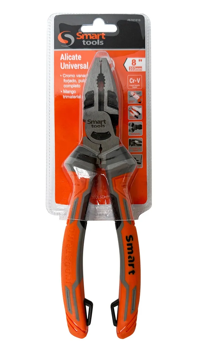 Especificaciones técnicas Marca: Smart Tools Origen: Importado Tamaño: 8″ Tipo de producto: Alicates Material: Cromo vanadio Peso Kg: 0.3625 Modelo: 6101010 Garantía Proveedor: 6 meses Largo: 8″ / 203 MM Contenido: 1 Pulgadas: 8″ Incluye: 1 unidad Uso recomendado: Ajuste de objetos / corte Uso: Profesional