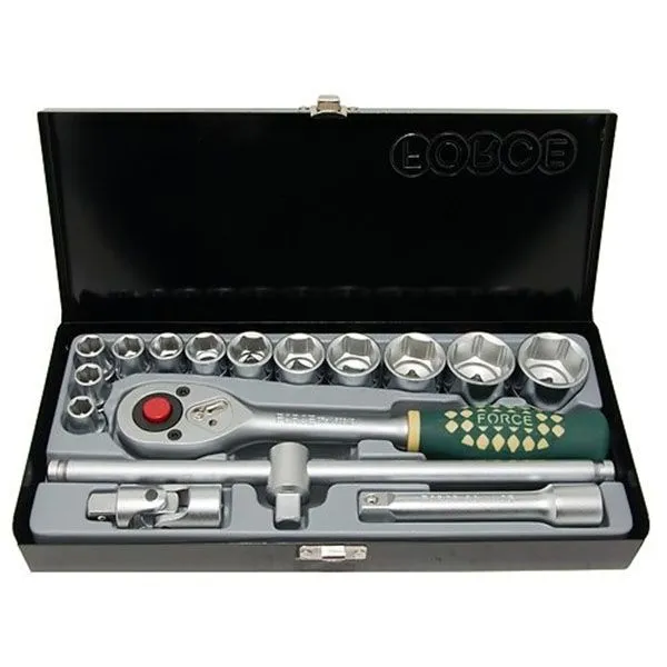 JUEGO DE DADOS DE 1/2″ de 10 – 32 mm. 16 PIEZAS, FORCE CROMO-VANADIO NIQUELADO. Tipo : Juego de Dados Set de 16 Piezas Material de construcción de cromo-vanadio. Excelente calidad y durabilidad Marca Force Modelo : 4162-5 Procedencia : Taiwán El kit incluye: 13 Dados Hexagonales Nº 10 – 11 – 12 – 13 – 14 – 17 – 19 – 22 – 24 – 27 – 30 – 32 mm. 1 Chicharra de 1/2 “ 1 extensiones de 5″ (127 mm.) 1 Barrote Corredizo 12″ (305 mm.) 1 Toma Cardanica 1/2″ 1 Caja de Transporte de Metal Dimensiones: 320 x 180 x 60 mm. Peso : 3.5 Kilos Especificaciones Técnicas Material : Cromo-Vanadio Niquelado Tipos de dados : Hexagonales Cuadrante : 1/2 ? in Rango de medida : 10 a 32 mm. Número de piezas : 16 Contenido del kit : Dados, Chicharra, Extensiones, Barra, toma y Maleta. Mango Ratchet : No Barra de extensión : Sí Barra en T : Sí Mango giratorio : Sí Unión universal : 0 Extensión flexible : No Acoplador : Sí