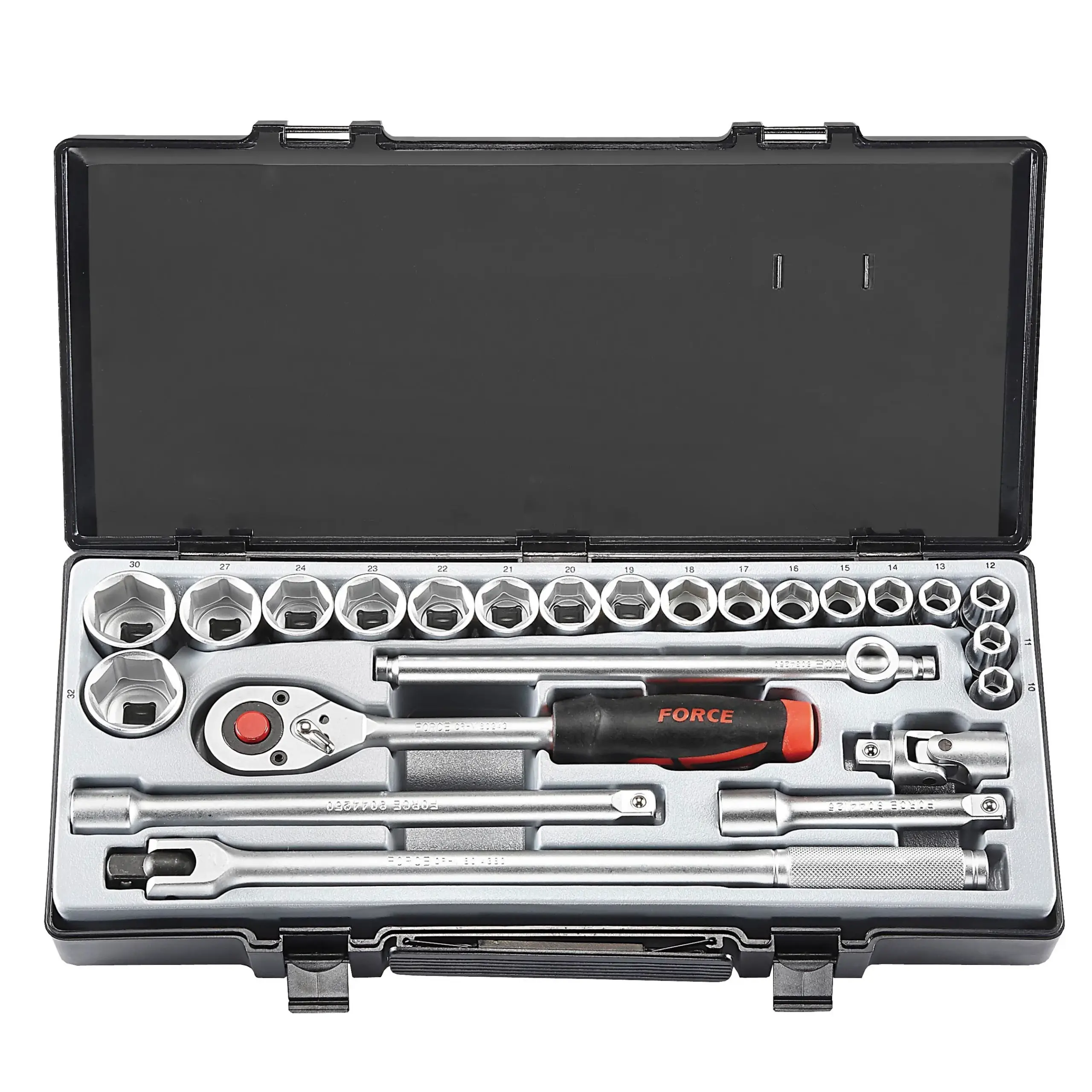 Juego de Dados Hexagonales Métricos de 24 piezas, 18 dados en rango de medidas desde 10 a 32 mm. ideal para ser usado en taller mecánico, trabajos de mantención tanto en casa como en la Industria, Set de 24 piezas con todos los accesorios para un buen trabajo. Tipo : Juego de Dados Métrico Hexagonal Set de 24 Piezas Material de construcción de cromo-vanadio Excelente calidad y durabilidad Marca Force Modelo : 4243-5 Procedencia : Taiwán El kit incluye: 18 Dados Hexagonales Nº 10 – 11 – 12 – 13 – 14 – 15 – 16 – 17 – 18 – 19 – 20 – 21 – 22 – 23 – 24 – 27 – 30 – 32 mm. 1 Chicharra de 1/2″ – 24 Dientes – Longitud 265 mm. 1 Barrote Corredizo tipo «T» de 10″ – 254 mm. 1 Barrote de Fuerza Giratorio de 15″ – 380 mm. 2 extensiones de 5″ y 10″ (127 mm. y 254 mm.) 1 Toma Cardanica 1/2″ en largo de 70 mm. Maleta de Transporte Plástica Dimensiones: 440 x 210 x 70 mm. Peso : 5.2 Kilos Especificaciones Técnicas Material : Cromo-Vanadio. Tipos de dados : Hexagonales Cuadrante : 1/2 ? in Rango de medida : 10 a 32 mm. Número de piezas : 24 Contenido del kit : Dados, Chicharra, Extensiones, Barra, toma y Maleta Plástica. Mango Ratchet : Sí Barra de extensión : Sí Barra en T : Sí Mango giratorio : Sí Unión universal : 0 Extensión flexible : No Acoplador : Sí