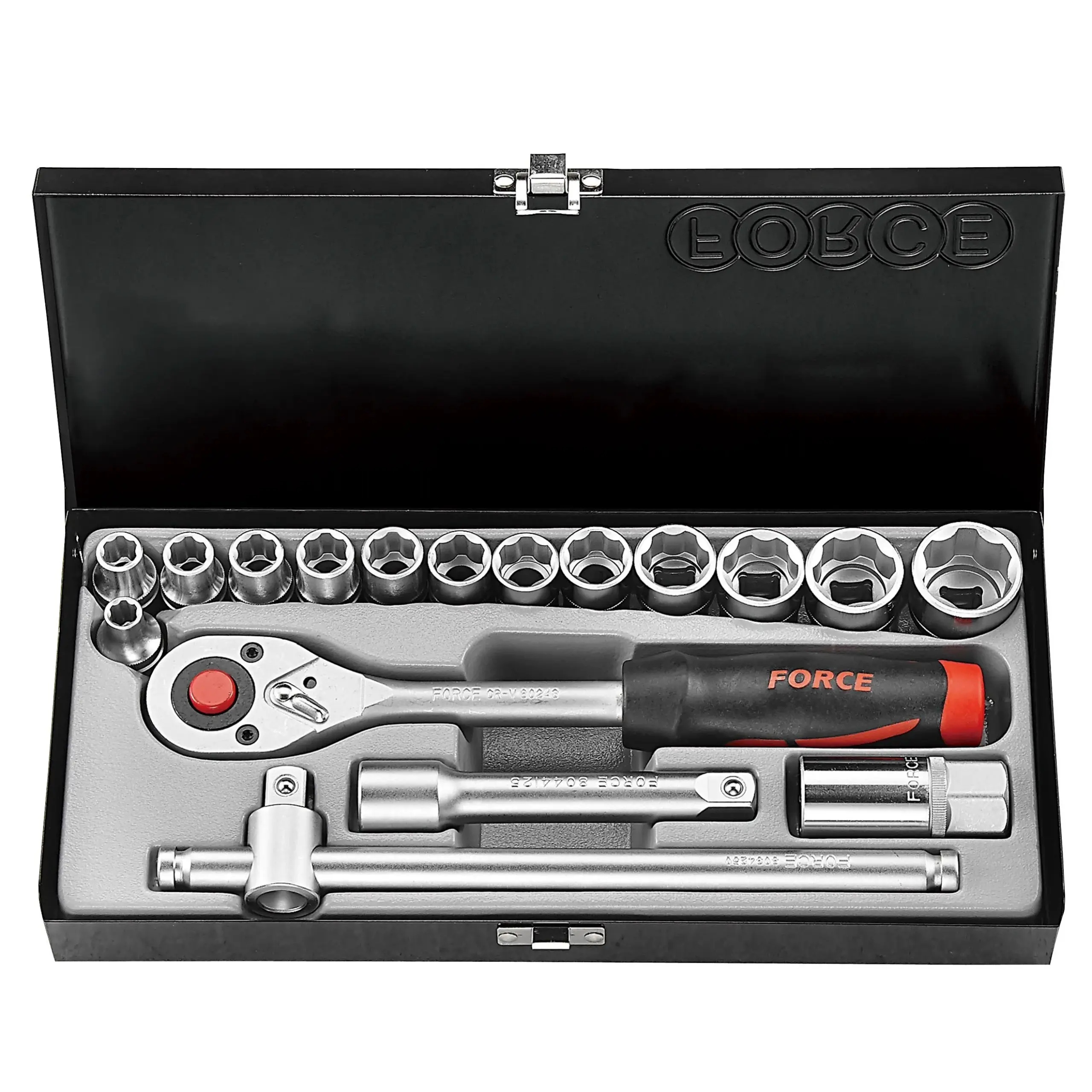 Juego dados, espiga 1/2" con 17 piezas, 13 cubos, 6 puntos y 4 accesorios. De Cromo Vanadio Niquelado. 4173-5 FORCE Descripción: Set de 17 Piezas Hexagonal Material de construcción de cromo-vanadio Excelente calidad y durabilidad Marca Force Modelo : 4173-5 Procedencia : Taiwán El kit incluye: 13 Dados Hexagonales Nº 8 – 10 – 11 – 12 – 13 – 14 – 15 – 16 – 17 – 19 – 21 – 23 – 26 mm. 1 Chicharra de 1/2 “ 1 extensiones de 5″ 1 Barrote Corredizo “T” 1 Dado de bujias : 20,6 mm. Dimensiones: 330 x 160 x 50 mm. Peso : 2 Kilos Especificaciones Técnicas Material : Cromo Vanadio Niquelado Tipos de dados : Hexagonal Cuadrante : 1/2 ? in Rango de medida : 8 – 26 mm. Número de piezas : 17 Contenido del kit : Chicharra, extensiones, Barrote Corredizo ?T?, Dado de bujías Mango Ratchet : Sí Barra de extensión : Sí Barra en T : Sí Mango giratorio : Sí Unión universal : Sí Extensión flexible : No Acoplador : No