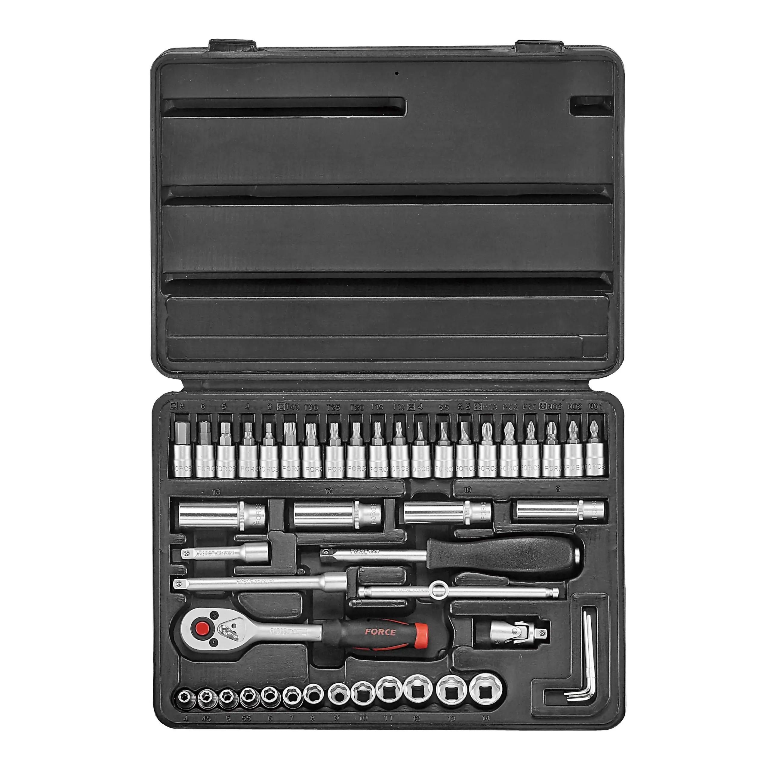 Juego dados de 46 Piezas Hexagonal Material de construcción de cromo-vanadio Excelente calidad y durabilidad Marca Force Modelo : 2461-5 Procedencia : Taiwán El kit incluye: 13 Dados Hexagonales Nº 4 – 4,5 – 5 – 5,5 – 6 – 7 – 8 – 9 – 10 – 11 – 12 – 13 – 14 mm. 04 Dados Hexagonales largos ( 50 Ml.) Nº 8 – 10 – 12 – 13 mm. 20 Puntas 03 Phillips PH.1; PH.2; PH.3 (32mmL) 03 Pozidriv PZ.1; PZ.2; PZ.3 (32mmL) 03 Paleta 4; 5.5; 6.5 mm (32mmL) 05 Allen 3; 4; 5; 6; 8 mm (32mmL) 06 Torx T10; T15; T20; T25; T30; T40 (32mmL) 1 Chicharra de 1/4″ (24 Dientes) 2 extensiones de 2″(50mm); 4″(100mm) Destornillador con toma de 1/4″ 6″(150mm) with 1/4″DR.(F) Barrote Corredizo 4.5″(115mm) Toma cardanica. 1/4″ 03 LLaves Allen 1.5; 2; 2.5 mm. Dimensiones: 270 x 200 x 55 mm. Peso: 1,3 Kilo Especificaciones Técnicas Material : Metalico Tipos de dados : Hexagonal Cuadrante : 1/4 ? in Rango de medida : 4 a 14 mm. Número de piezas : 46 Contenido del kit : Dados, Chicharra, Extensiones, Destornillador, Adaptador, Puntas Mango Ratchet : Sí Barra de extensión : Sí Barra en T : Sí Mango giratorio : 0 Unión universal : 0 Extensión flexible : No Acoplador : Sí