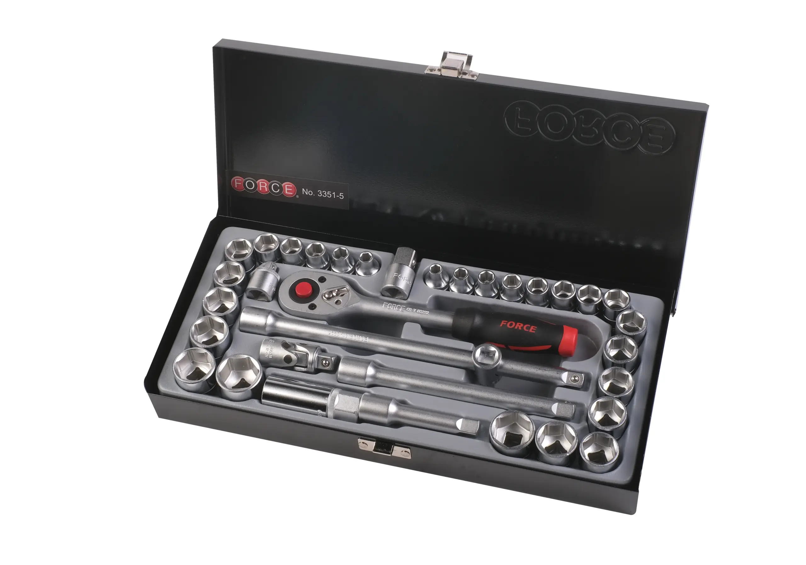 Juego de Dados Hexagonales Métricos y Pulgadas de 35 piezas, 15 dados métricos en rango de medidas desde 6 a 21 mm. y 11 dados en pulgadas rango de medidas desde 1/4″ – 7/8″. Ideal para ser usado en taller mecánico, trabajos de mantención tanto en casa como en la Industria, Set de 35 piezas con todos los accesorios para un buen trabajo. Tipo : Juego de Dados Métrico-Pulgada Hexagonal Set de 35 Piezas Material de construcción de cromo-vanadio Excelente calidad y durabilidad Marca Force Modelo : 3351-5 Procedencia : Taiwán El kit incluye: 15 Dados Métricos Hexagonales Nº: 6 – 7 – 8 – 9 – 10 – 11 – 12 – 13 – 14 – 15 – 16 – 17 – 18 – 19 – 21 mm. 11 Dados SAE (Pulgada) Hexagonales Nº: 1/4″ – 5/16″ – 3/8″ – 7/16″ – 1/2″ – 9/16″ – 5/8″ – 11/16″ – 3/4″ – 13/16″ – 7/8″. 1 Chicharra de 3/8″ – 24 Dientes – Longitud 200 mm. 3 Extensiones de 3″, 6″ y 9″ (75 mm., 152 mm. y 228 mm.) 1 Adaptador para extensión de 3/8″ H – 3/8″ M 1 Adaptador de 3/8″ H – 1/4″ M 1 Adaptador de 3/8″ H – 1/2″ M 1 Barrote Corredizo tipo «T» 1 dado de Bujías en 16 mm. 1 Toma Cardanica 3/8″ en largo de 46 mm. Maleta de Transporte Metalica Dimensiones: 330 x 165 x 55 mm. Peso : 3.2 Kilos Especificaciones Técnicas Material : Cromo-Vanadio Tipos de dados : Hexagonales Cuadrante : 3/8 ? in Rango de medida : 6 a 21 mm. Número de piezas : 35 Contenido del kit : Dados, Chicharra, Extensiones, Barrote, Maleta Metálica Mango Ratchet : 0 Barra de extensión : Sí Barra en T : Sí Mango giratorio : Sí Unión universal : 0 Extensión flexible : No Acoplador : Sí
