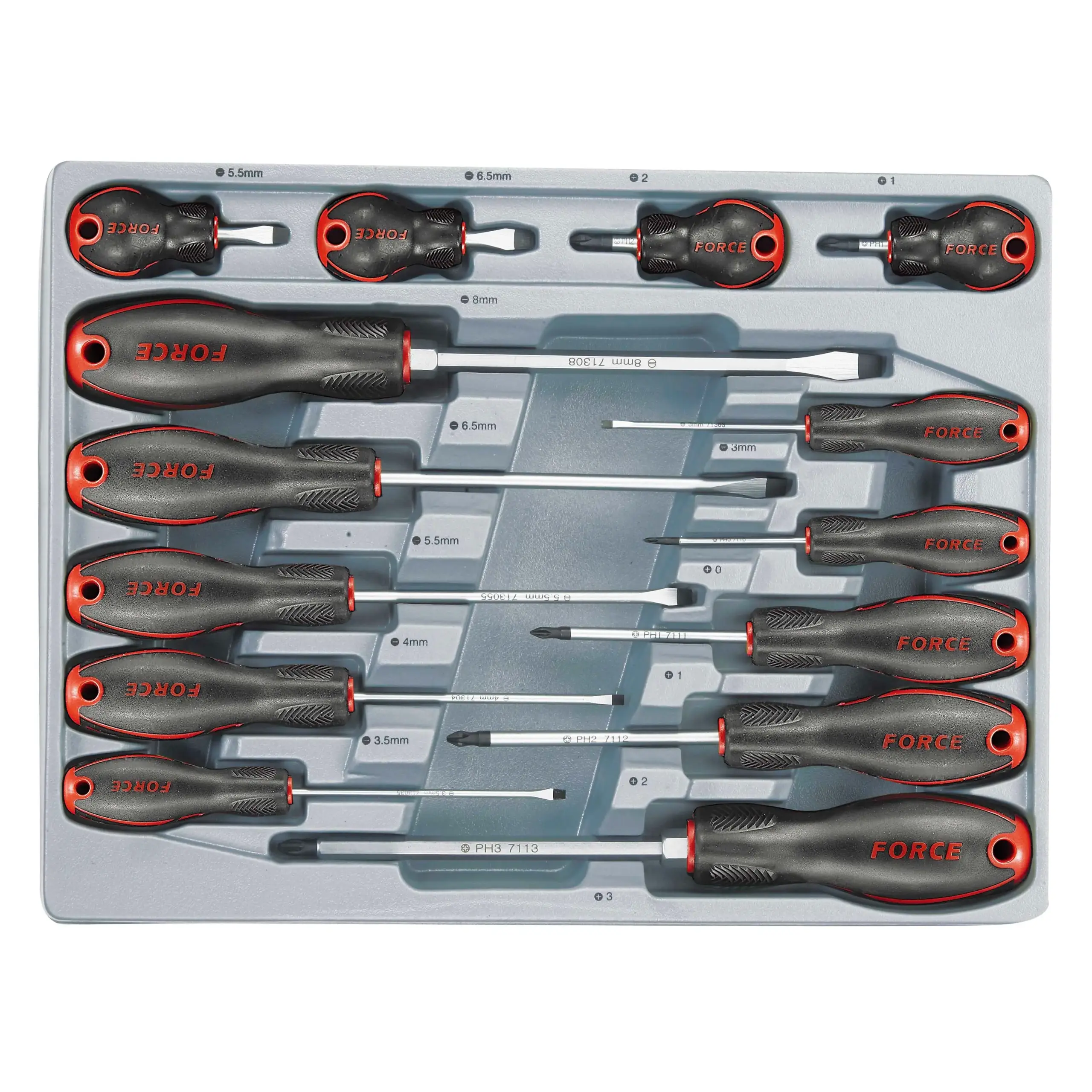 Juego destornilladores Punta Paleta Marca : Force Código : 2142 Nuevo diseño con Mango ergonómico Antideslizante. Construcción en acero Cromo Vanadio tratadas térmica mente. Set de 14 Pizas 8 Punta Paleta 6 Punta Phillips Caja de transporte Plástica Medidas: 380 X 280 X 45 mm. Peso : 1.4 Kilos. Especificaciones Técnicas Uso : Profesional Tipos de destornilladores : Paleta y Phillips Tamaños : Varios Material : Acero Cromo Vanadio Características del mango : Mango ergonómico Antideslizante Número de piezas : 14 Punta magnética : Sí Apto electricidad : Sí
