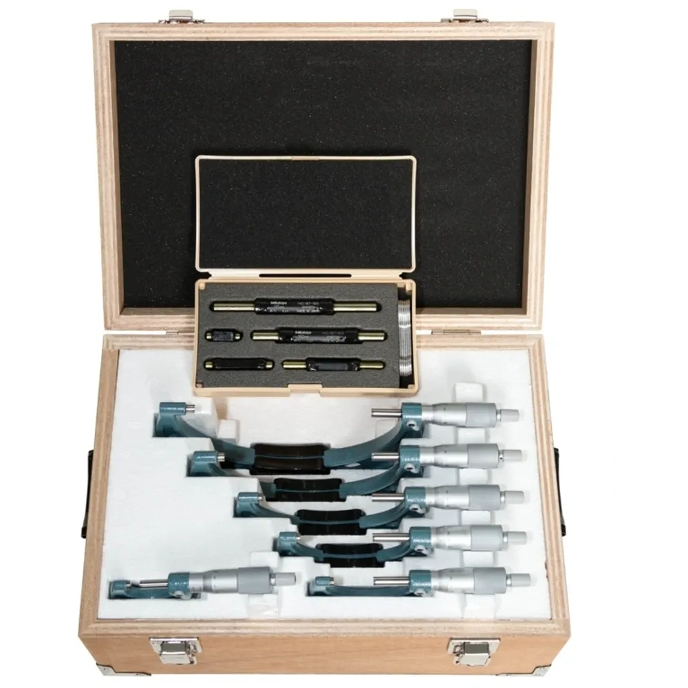 Arco esmaltado. Caras de medición de carburo. Equipado con trinquete para una fuerza de medición constante. Placa de aislamiento térmico. Serie:103 Modelo:Externo en juego Capacidad:0-150mm Resolución / Graduación:0,01mm Notas / Obs.:Composto por 6 micrometros e barras padrão (5 pçs)