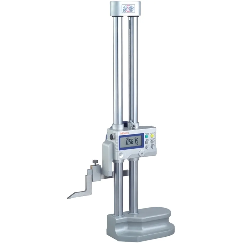 Estructura de doble columna garantiza la exactitud de la medición de altura. La base de ergonómica se adapta cómodamente a la mano. La altura de los caracteres de la pantalla LCD se incrementaron (10mm a 11mm) y se adoptó una pantalla de alto contraste, lo que mejoró la lectura. Permite la Integración en el control el estadístico de Procesos y Sistemas de Medición. Referirse a la página 2. La Inclinación de la perilla mejora la ergonomía del cursor. Pila SR44 (1 pza.), Código 938882. Para verificar la operación inicial (accesorio estándar). La vida de la pila es de 3 500 horas de uso continuo. El trazador largo con punta de carburo (No. 905200 con longitud total de 150mm) se incluye como accesorio estándar. (Accesorio estándar: sujetador del trazador No. 05GZA003). Para Superficies planas de referencia, referirise a la página 268. Palpador de señal de contacto bidireccional disponible como accesorio opcional. Serie:192 Trazador de altura digital Modelo:Multifunción con salida de datos Capacidad:500mm/24" Resolución / Graduación:0,01mm/.0005" Exactitud:±.0015"